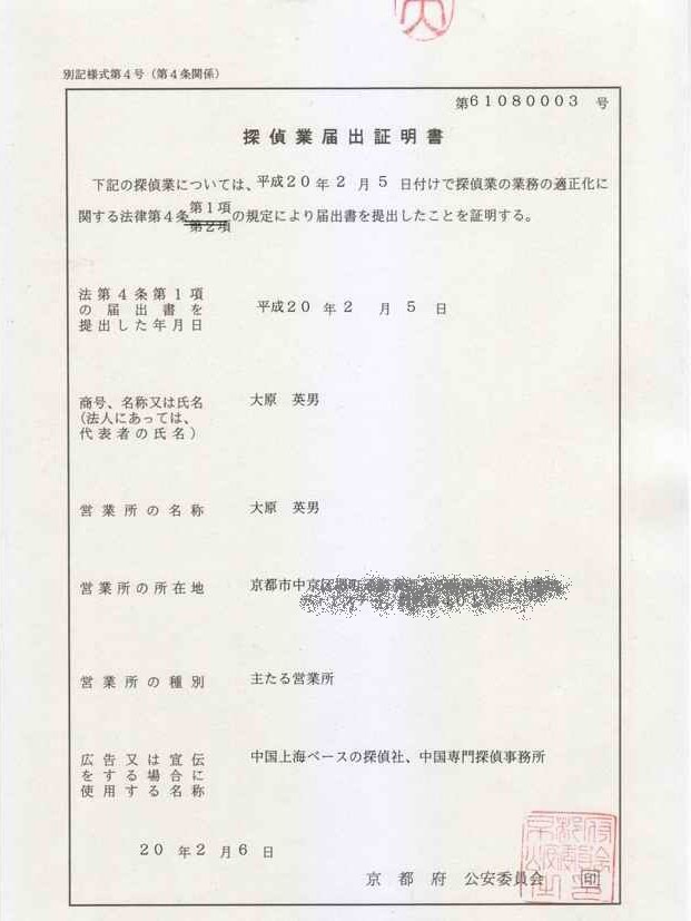 2008/02/06、法律改正にともない探偵業に対し公安委員会への届け出が必要になったため各種資料を提出し「探偵業届け出証明書」を入手した。事務所への掲示義務、年一度の立ち入り調査が行われることになった。 |