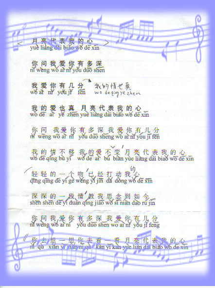 上海駐在中(1997-1999年)にはカラオケによく行った。中国の曲は比較的歌いやすかったが、中国語が殆どできないため、知り合いにピンインを書いてもらった。下の歌詞はホテルの従業員に頼んだら、親切にもタイプしてくれた。ホテルで覚えてはカラオケで歌うようにした。7−8曲の持ち歌ができ、歌だけ聴くと中国語がべらべらと勘違いされることも(?)
