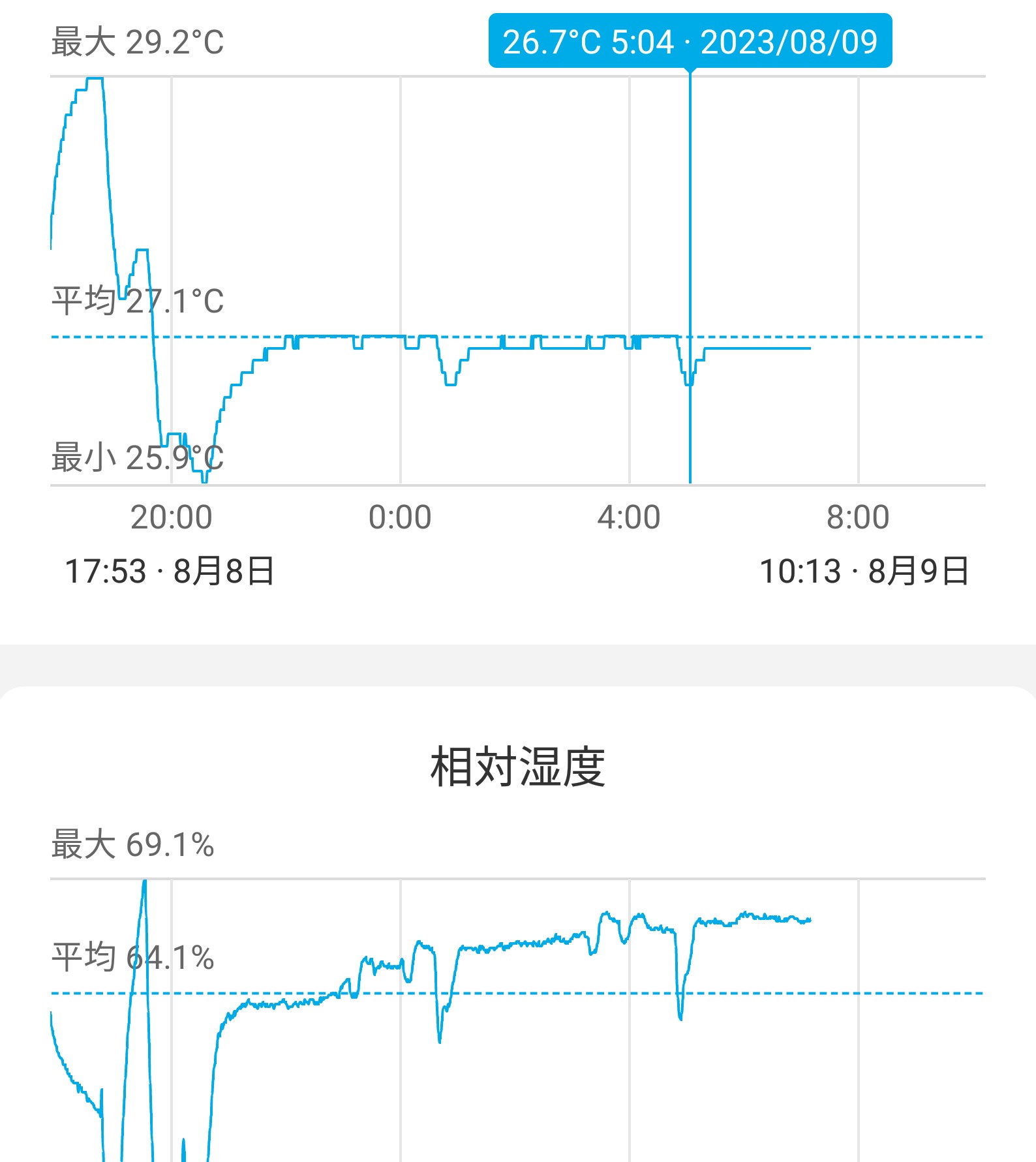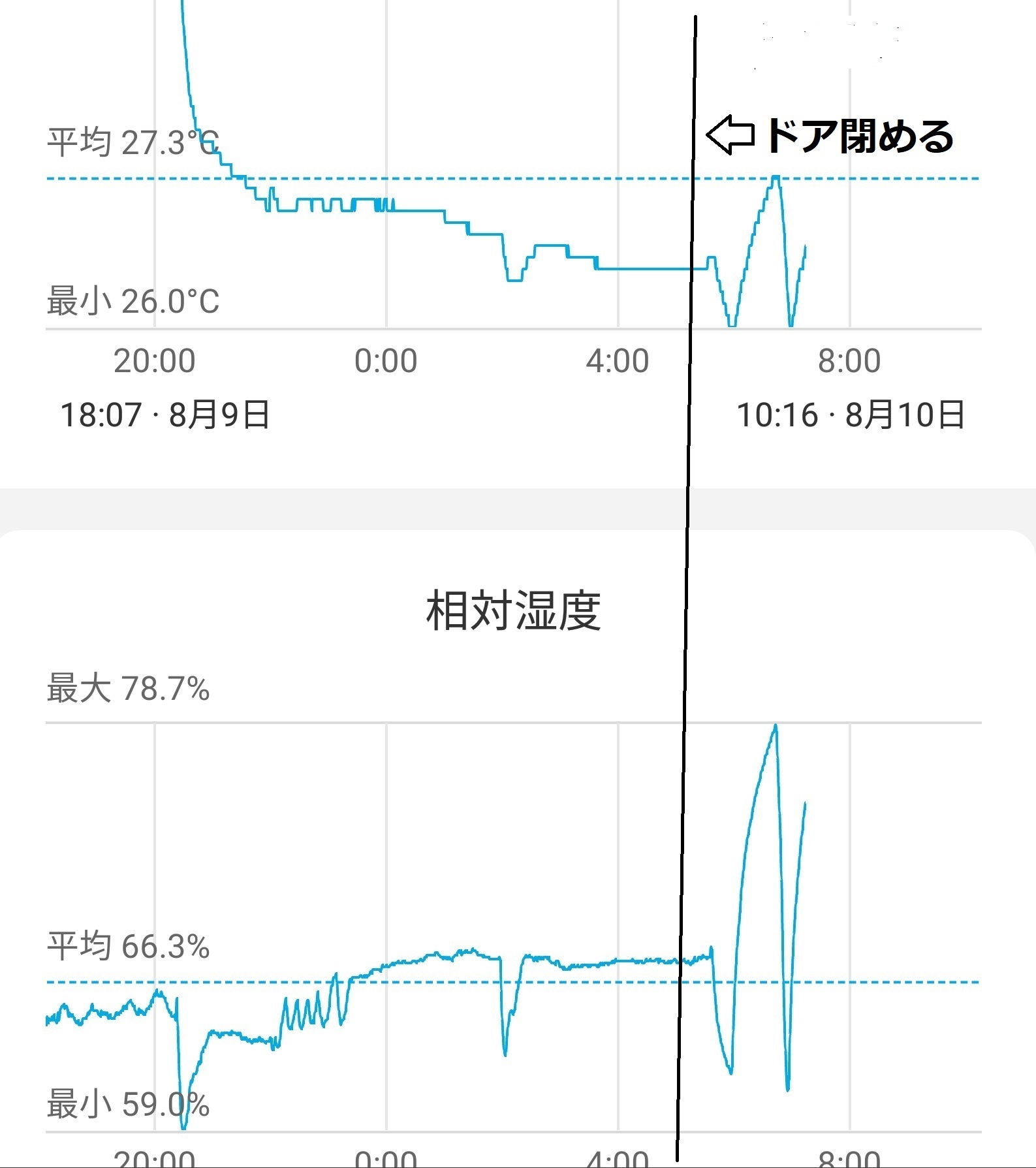 翌日も測定しました。7時間で温度変動範囲は0.6度、その後ドアー閉めたら2時間で温度変動は1.3度、湿度も67.8から78.7%まで上昇しました。ドアーを少し開けることで室温、湿度とも安定することが確認できました。但し、正確な理由がよくわかりません。
