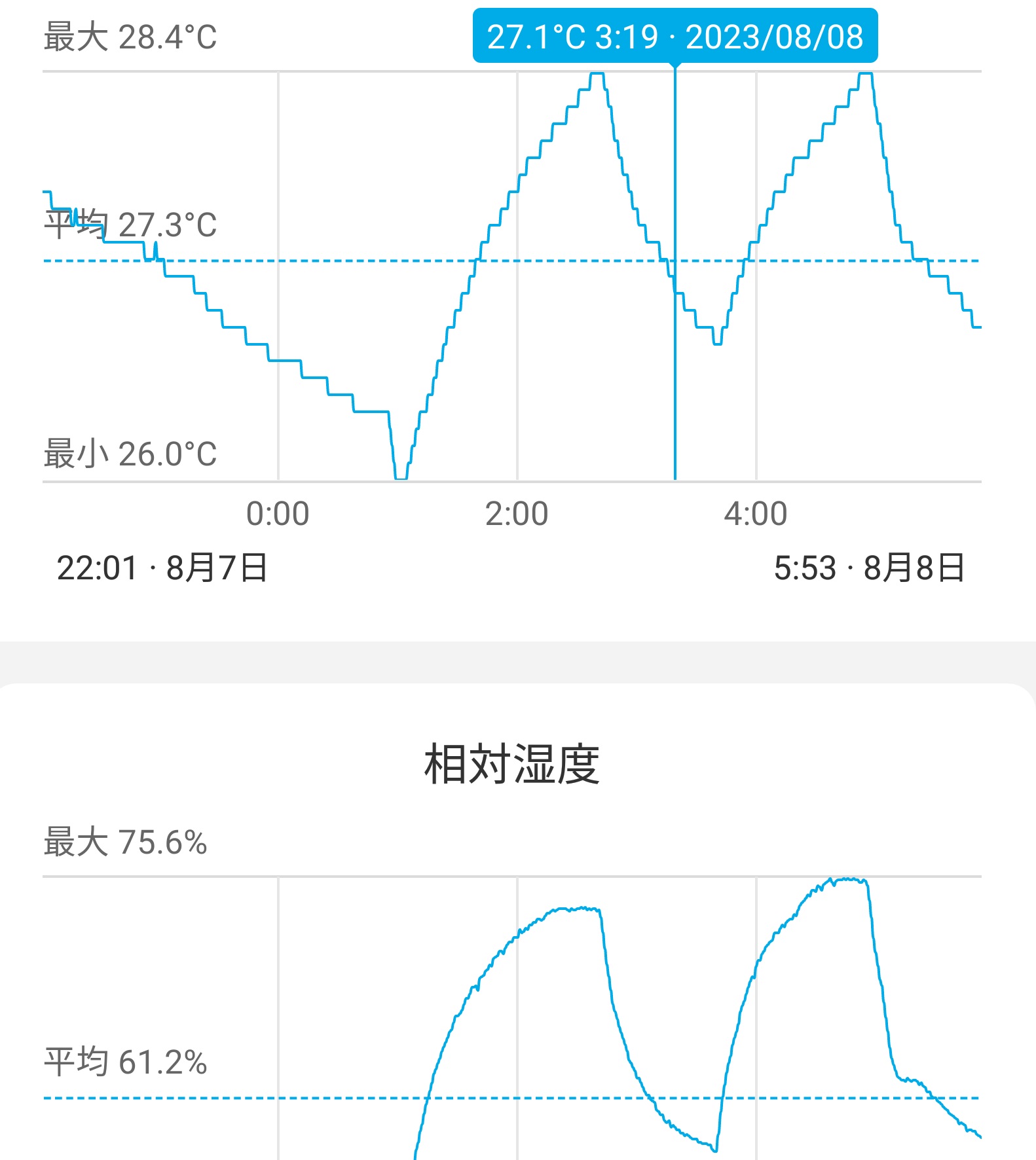 3.室温が一定しないのはエアコンの温度検出に問題があるのではとの思いから、サーキュレータの風を対角線上、高さ1mより室内機にぶつけるようにしました。結果は全く効果がありませんでした。設定温度28度、平均室温27.3度、平均湿度61.2%、最高室温28.4度、最高湿度75.6%、室温変動幅は2度以上(26.0~28.4度)ありました。就寝中3回ほど気温、湿度の上昇する山ができたましたが、山が緩やかで不快な時間が長くなりました。