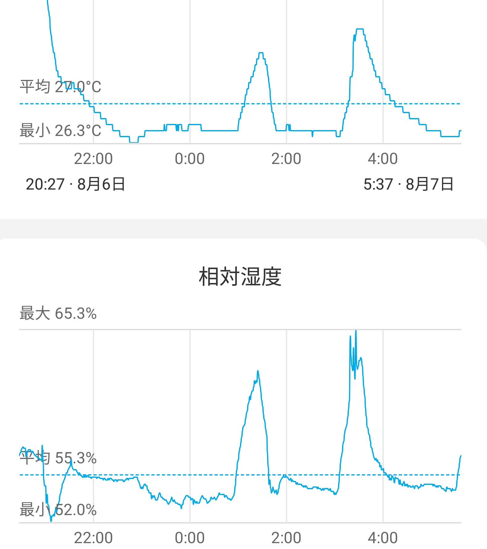 4.最後に、設定温度27度でエアコンを除湿運転(弱冷房)し、部屋のドワーを30cm開けてみました。これは、除湿戻りをなくすためにはエアコンの運転が止まらないようにすれば、との思いで行いました。結果は室温27.0〜27.1度の範囲でほぼ一定し、2回、一時的に26.7度まで下がりました。これを含めても変動範囲は0.4度、湿度も61.9〜67.7の範囲に収まりました。湿度がもう少し下がれば最高ですが、十分満足できるものと考えます。(下記のグラフ22時〜7時の間、温度湿度とも他と比べ安定していることが分かると思います)